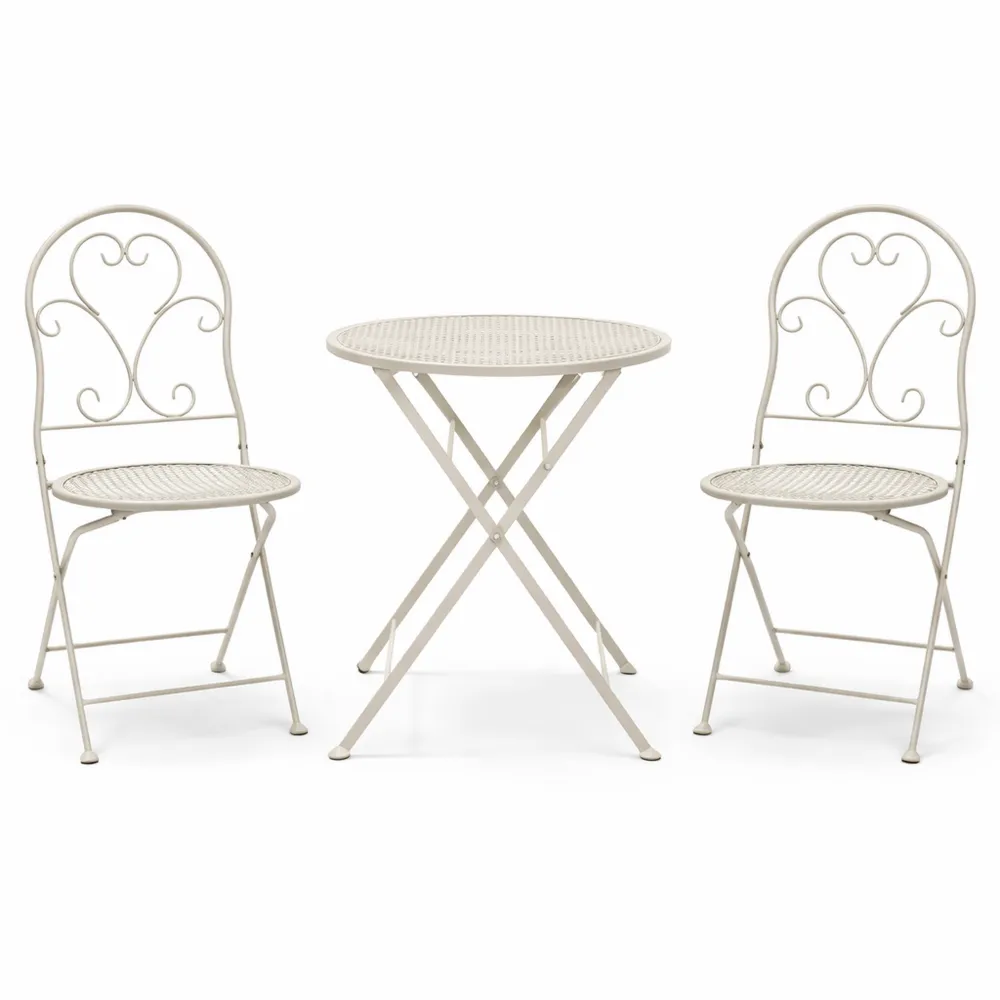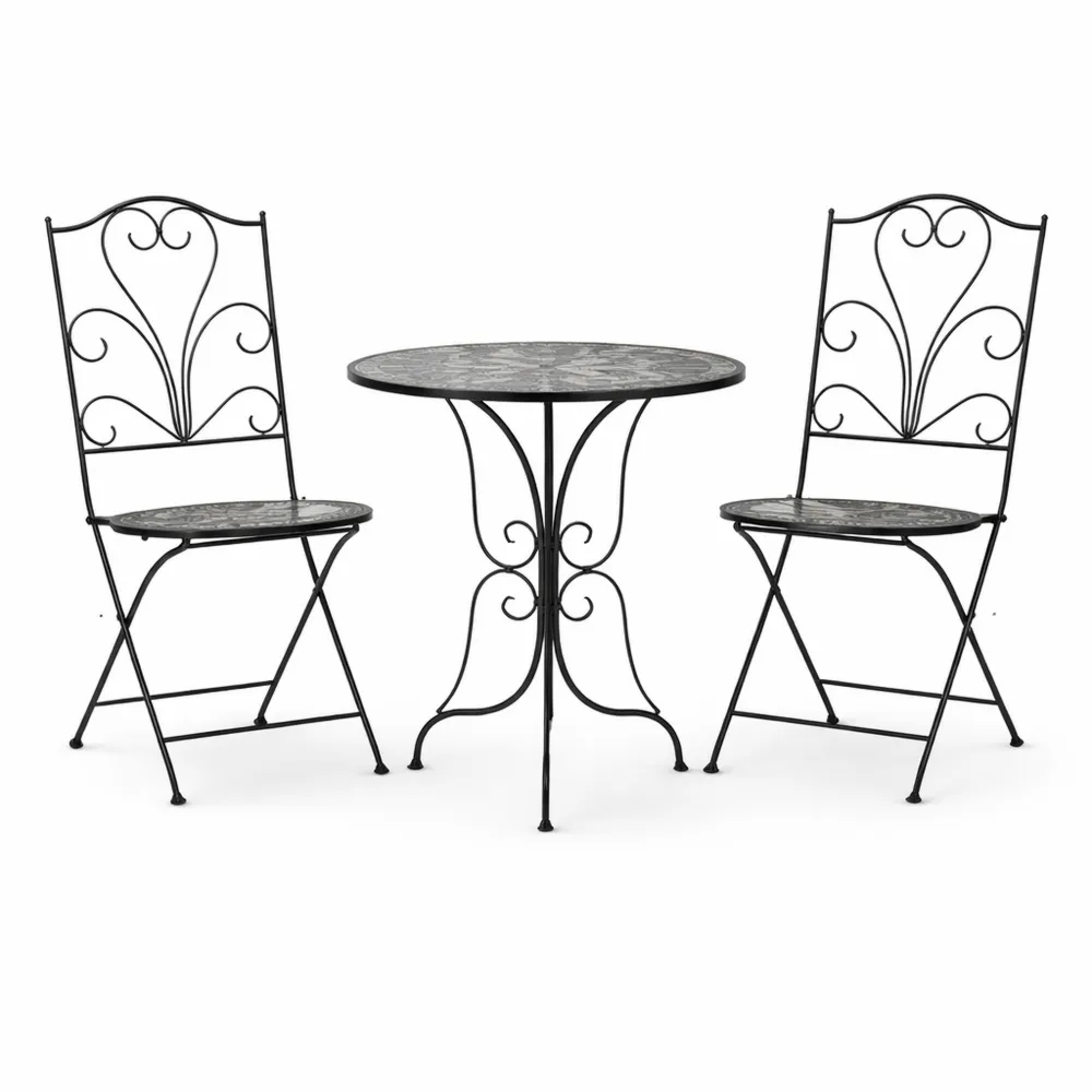 Set con tavolo e due sedie. Materiali resistenti alle intemperie. Struttura funzionale per balcone o giardino. Facile da pulire e da usare.